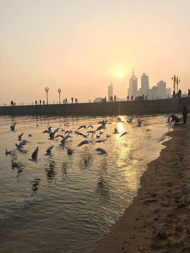 栈桥初建于光绪十八年(公元1892年),是青岛最早的码头。经1931年改建和1985年整修,现宽8米,全长440米。桥南端筑半圆形防波堤,堤内是一座具有民族风格的两层八角亭,金瓦朱壁,盔顶飞檐,题名“回澜阁”。 栈桥划波斩浪,象一条长龙横卧于碧海银波。循桥渐入,仿佛走进大海的怀抱;伫立阁旁,层层巨浪澎湃涌来,拍打堤坝,击起万千碎玉;进入阁内,沿螺旋楼梯登到楼上,四周尽是宽敞的大窗,放眼望去,又是另一番怡人风景,“飞阁回澜”因此被誉为“青岛十景”之一。 秋天涨潮时,尤以西部岸堤景色最佳,海浪拍岸,激起数十米巨浪,轰然作响,蔚为壮观,退潮后,海水后退一百米,礁岩沙滩上满是赶海挖蛤蜊的游人。近年来,青岛开展了“挽留海鸥”活动,每到秋冬风平浪静时,成千上万只海欧在湾内低飞回翔,与蔚蓝的天,远处的回澜阁、近处观景赏海的人们构成一幅和谐画卷。