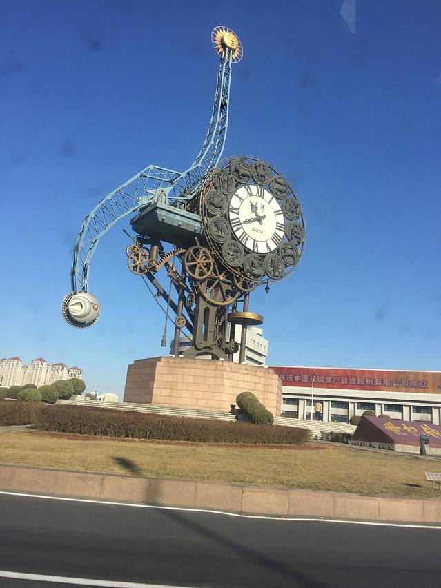 该钟每面直径14米,面积约154平方米,12个直径2.6米、重约1吨的铸铜浮雕分别为12星座。钟摆上下,日月辉映。钟盘圆周,众星拱卫,中西交融,天人和一,古典与现代浑然一体。盘芯及钟指针采用花档镂空制作,显得古朴典雅。厚重的锻铜底座上布满大小齿轮、链条以及巨大的钢制螺钉、铆钉,与古老的解放桥互相映衬,向人们诉说着中国的近代工业从这里开始。