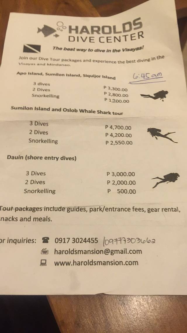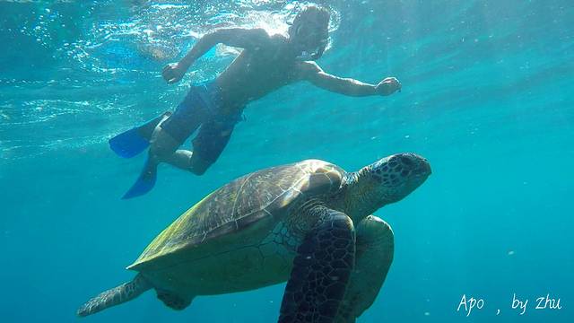 有3种方式可以去APO岛看海龟,我墙裂推荐报哈罗德潜水中心(Harold's diving center)的APO岛浮潜,一日三潜,1200P,包含简单的午餐。小黑也会陪同下水,帮忙找海龟并确保你的安全,导游费都省了。另外两种方式,分别是自己去和网上报团。