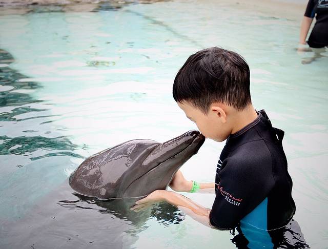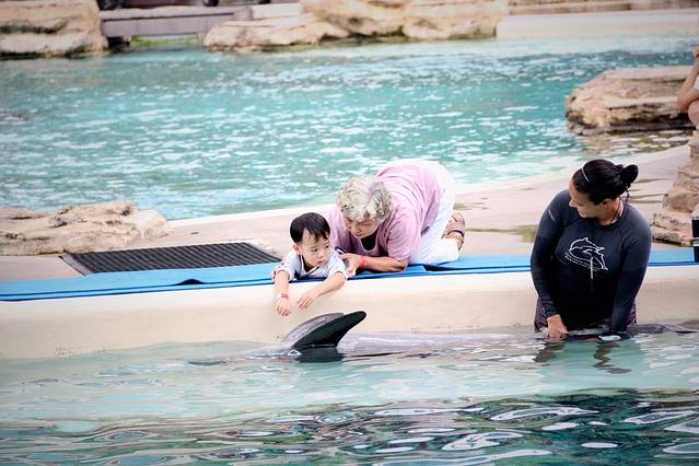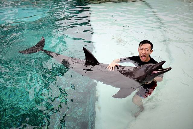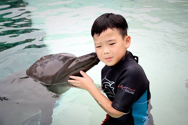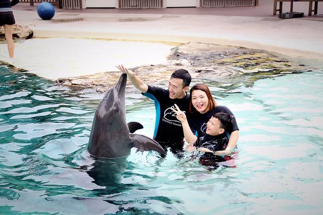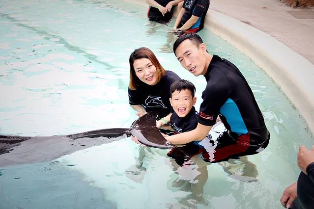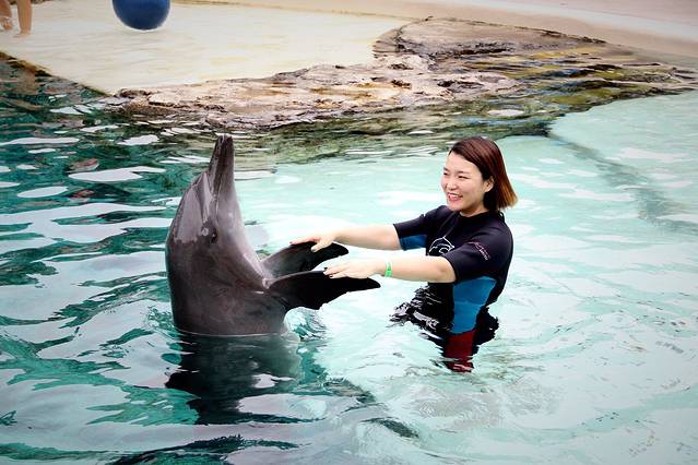 海豚训练师都是外国人,需要英文交流。还好我和爸爸都会英文,沟通还比较顺利。不过即使不会英文,应该也能听得懂一些。