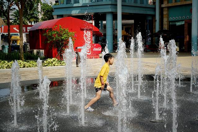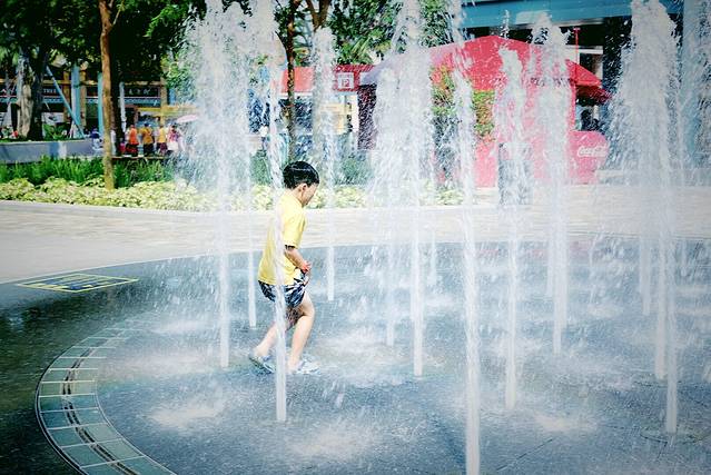 广场有个小喷泉,哥哥好喜欢在这里穿来穿去。弟弟看了很是羡慕,可又没有跟上去的胆量。