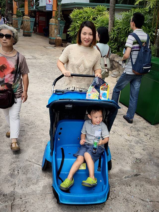 环球影城里面有租推车,我们租了个双人的。我们租车主要是害怕弟弟等会想午睡,好有个地方依靠
