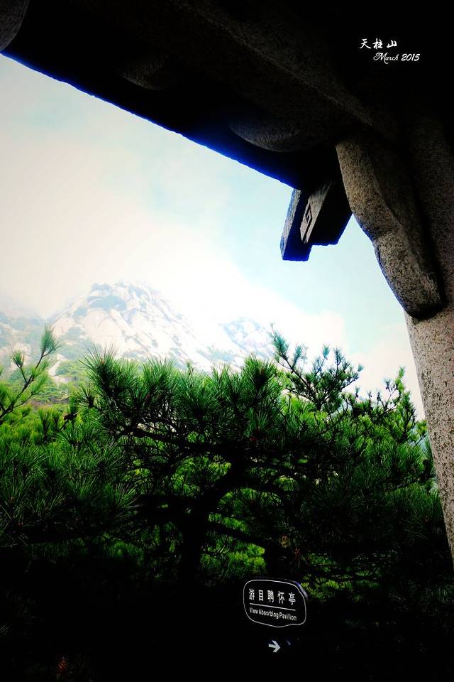 一点,游目聘怀亭。刚才的奇谷天梯心惊肉跳,腿抖个不停!亭中休息,太阳却出来了,真TNND的人品呀!看看刚才走下来的依旧笼罩在云中的峰顶,着实佩服自己!