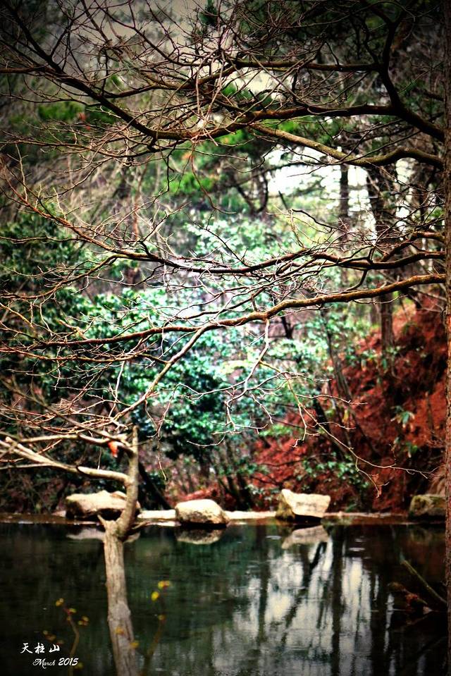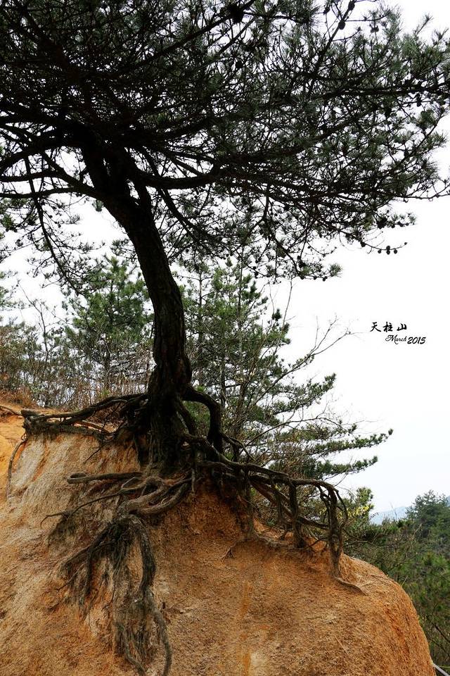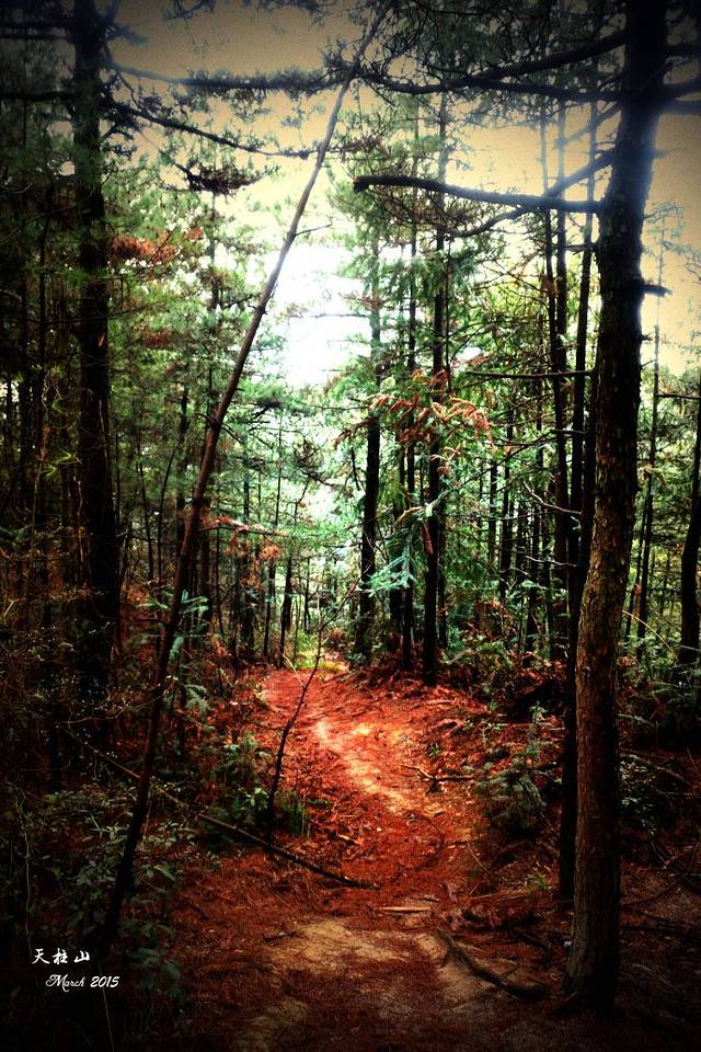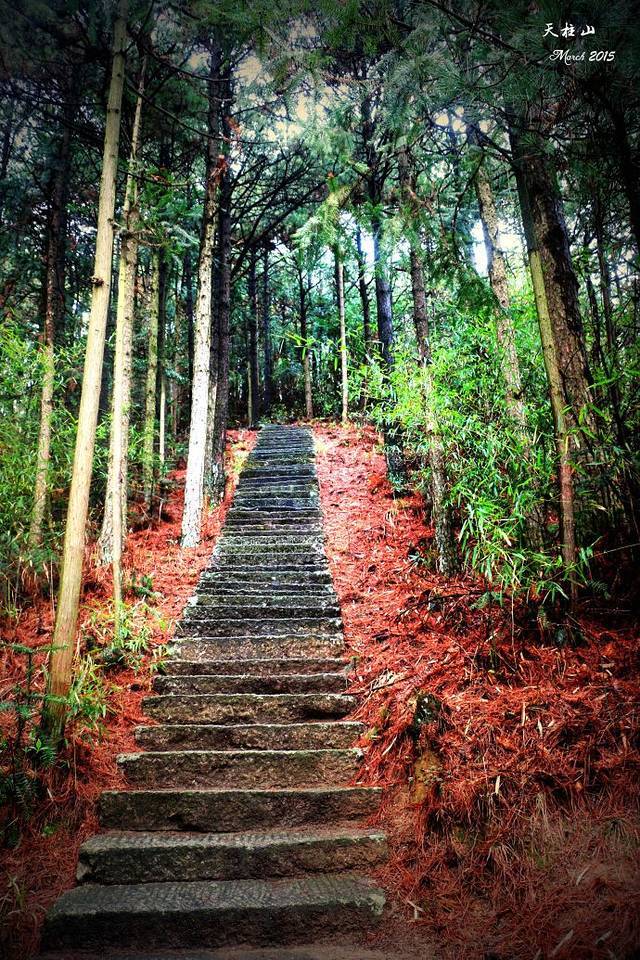 看到天柱峰一半不到的风景。蓝色是西关线路,红色是东关线路,西关美,东关险。我第一天走的西关蓝色线路,花了六个小时。尤其是东关,我在第二天也走了六个小时左右,道路险峻,台阶坍塌,雨雾湿滑,道路难辨,全程没有遇到一个人。走过之后的经验是,没有很好的心理准备的话还是不要走这条路了。绿色的虚线是可以一天走下来的线路,大概要花十个小时,可以说风景尽收眼下。但是体力嘛,行前要考虑清楚。不然前不着村后不着店,后悔都没有办法。如果速度太慢天黑以后你还没有下山,身在西关还好,如果在东关你就麻烦大了!