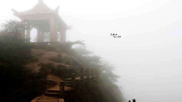 这是丹砂亭,如果你看到这个亭子就说明你走错路了,洒家就是这样。从这里下去的浓雾中我来回了几次,都没有找到下山的路。只好原路返回,给文德山庄的大娘打电话询问路线。(幸亏此地还有手机信号,之后就难了!)面对索道站口的左侧台阶通往飞虎峰和迎真峰,才是下山的路。而索道站口前数十米右侧的道路是通往丹砂亭的,自己刚才就走错了,耽误了半个小时不止。。行前攻略虽然在心,只看地图以为丹砂亭是必经之路,谁知只是一个相邻景点而已。。。