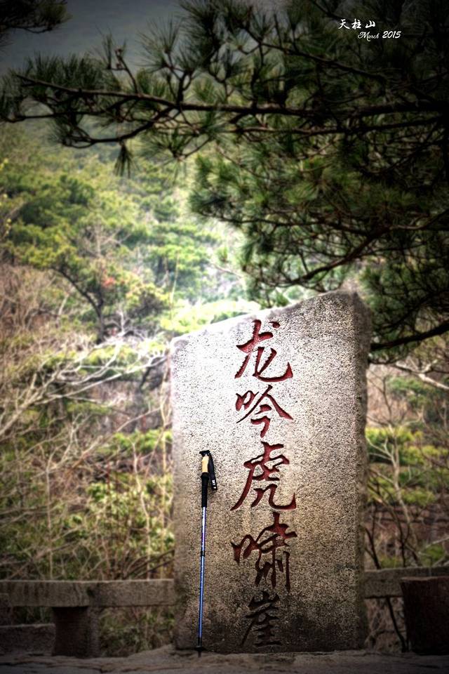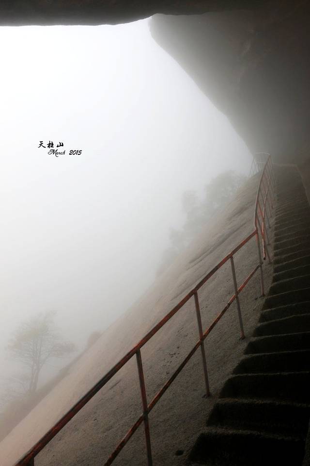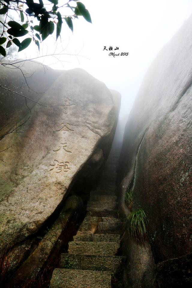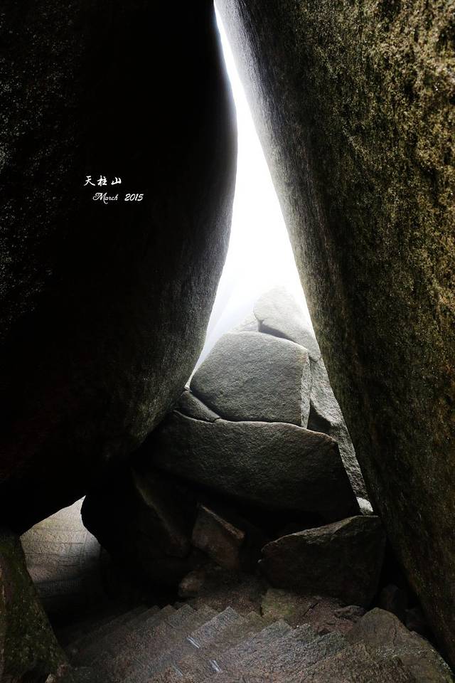 路线是:天柱山庄-丹砂亭(我在这里迷了路)-飞虎峰(风景绝佳之地)-迎真峰(最为陡峭的地方)-画眉岭(从这里开始东关路线,旁边就是昨晚的炼丹湖岔路口,这里有禁止进入东关的标志牌)-回音台-叠翠亭-大天门(大天门之前的这段路叫阳关三叠,就是W形路线,高度让人崩溃不说,台阶坍塌,树木倒伏,一定要小心)-鹊桥(奇险之地)-奇谷天梯(奇窄奇陡)-游目聘怀亭(到这里,算是安全了)-鹦哥石(之后的路没有了台阶,也就没有路了)-全力古井酒店(算是东关线路结束了,平缓宽阔水泥路,前行约五百米到索道站)-东大门(乘景区车回南大门拿背包)。