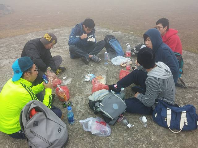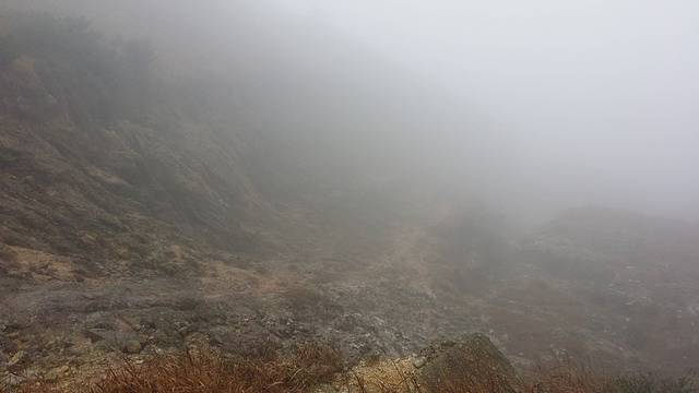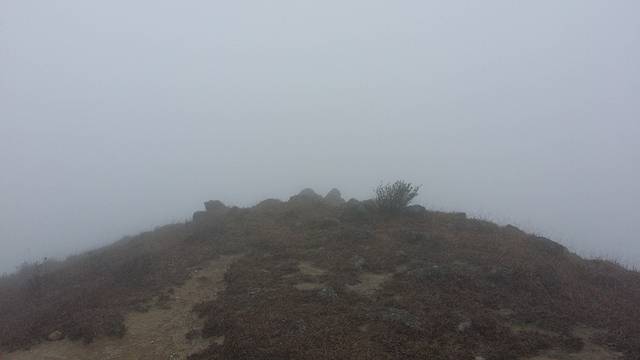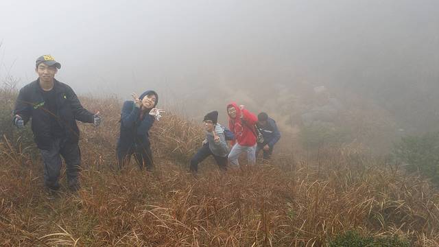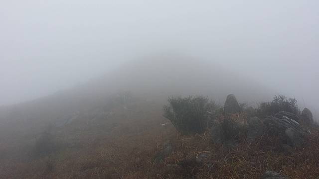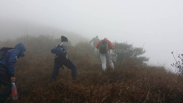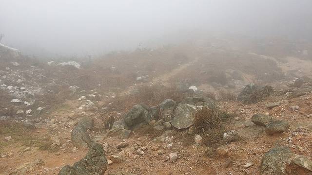 荒凉的草坪上休息了半个多钟头,期间雾有消散的迹象,不过很快又再次变浓。上次爬天露山我们只是到达这里就返回了,之后的路况我们不了解。在不知道方向的情况下,开始犹豫是否需要原路返回。然而我心有不甘,没理由两次到来都折戟半山腰,我说出了自己的想法,也得到了一部分队友的支持,最终我们决定,硬着头皮,继续冲上云霄。