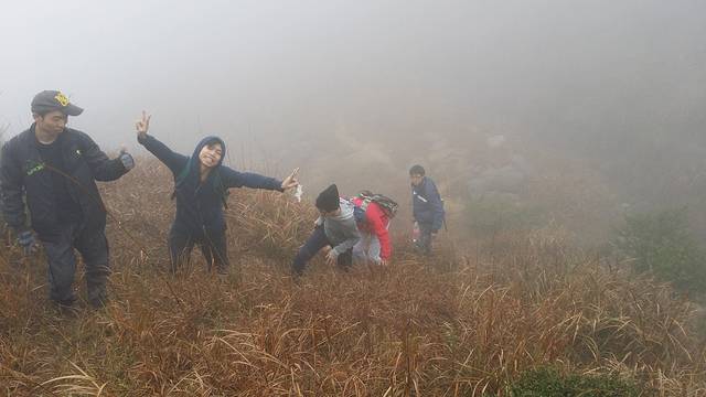 好在,走了十多分钟倾斜的杂草路后我们终于回到了登顶主路了。沿着大路走,到达山顶只是时间问题,大家也不由得松了口气,看来刚才做的路标应该派不上用场了。