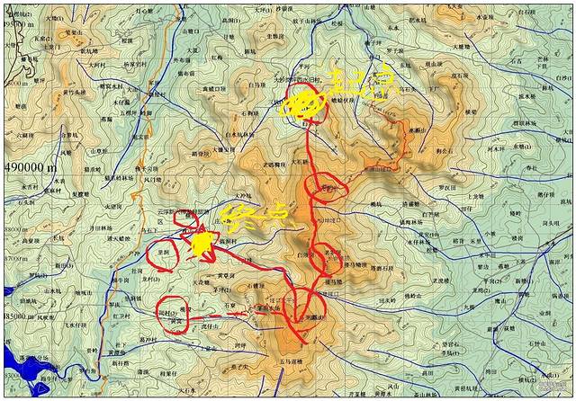 探险前做好的路线图(貌似有点不切合实际。) 登山队打算由开平大沙镇岗坪上山,登顶天露山主峰后,取道新兴方向下山,在禅龙峡景区或者附近的里洞镇找住宿。
