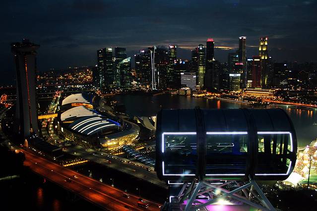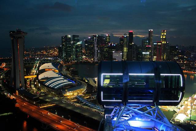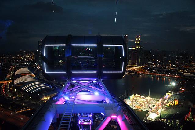 新加坡摩天轮座落于新加坡河畔,可以远眺滨海艺术中心、滨海湾金沙酒店、F1新加坡站赛道、科学艺术博物馆等等,它的高度超过了130米的伦敦眼,旋转一周约30分钟时间。