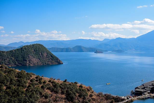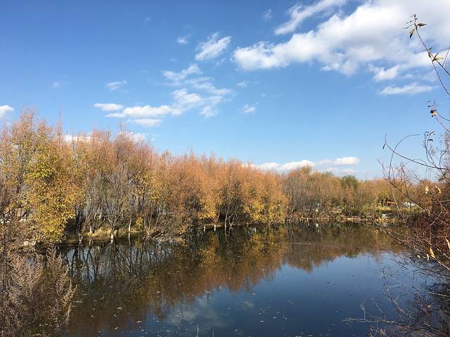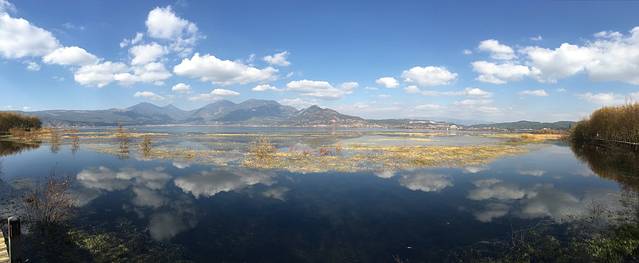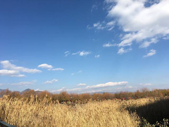 一夜过去,第二天前往拉市海湿地公园,个人建议不报团,直接滴滴打个车,20多分钟就到,除非你想划船和骑马,我对这两样都没什么兴趣,所以直接打车就好。门票20块钱,湿地公园很大,人也很少,沿着观鸟栈道走就可以,风景还是很好的,拉市海的水也很干净,那天 划船的很少,水面很平静,阳光温热,天蓝,云美,真的很享受,在拉市海比较适合带个广角镜头,我没有那样的设备,只能用手机拍全景图片。