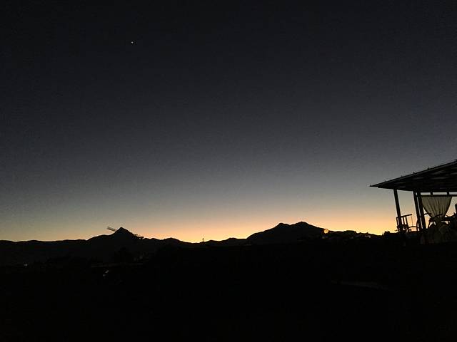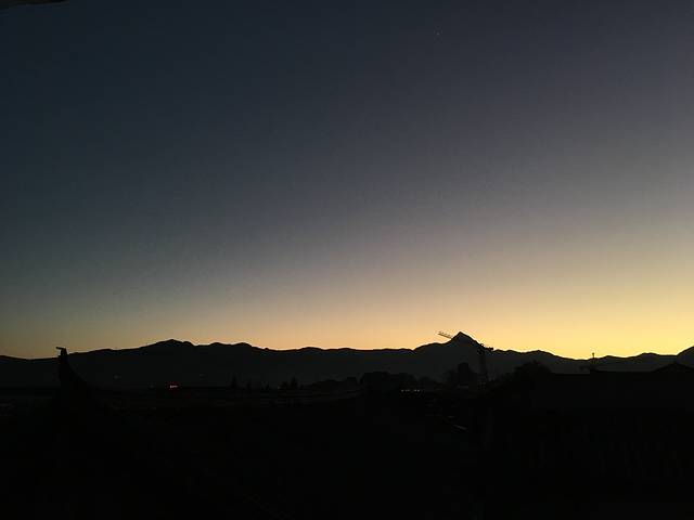 回到丽江的时候,天色已晚,但是客栈有露台,正好可以看日落晚霞,虽然没有云彩,但是干净的天总不会让你失望的。然后我就看到了 这种紫色的傍晚,很浪漫。