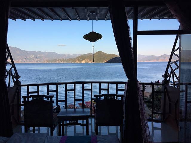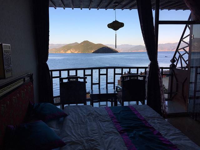 由于我们比较随性,又是淡季,来泸沽湖没有提前订房,到站之后才去找的,湖边很多住宿,都有湖景房,看了一圈感觉九七之约和栖海听风(水云间)性价比不错,其他的我都没太看得上,最后入住了栖海听风水云间店的一间大床房,价格和网上一样,268一晚。晚上可以看到皓月当空,早晨可以看到天边的红晕,心情真是好到爆炸。