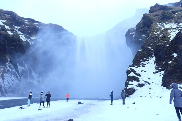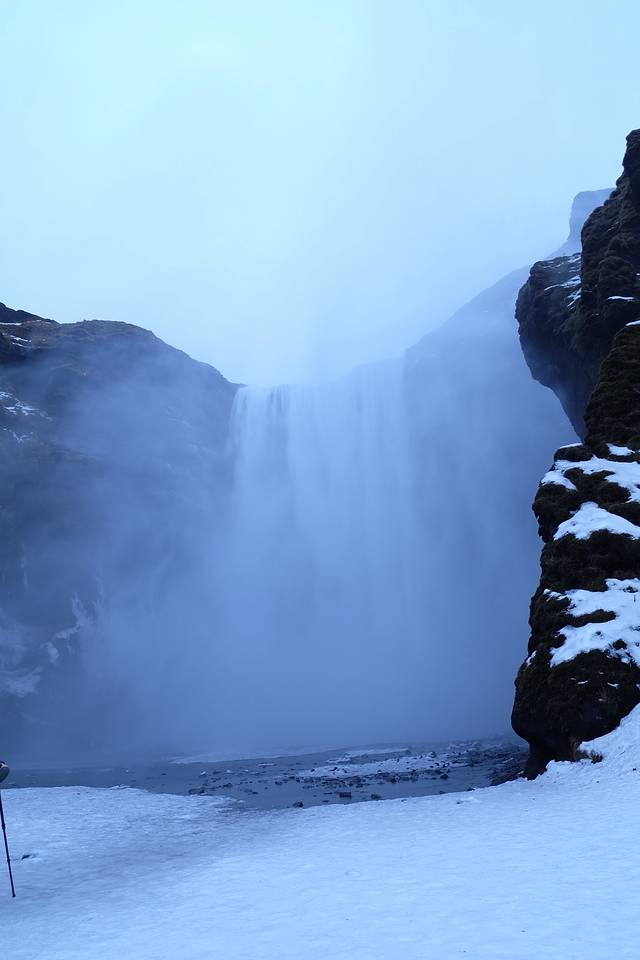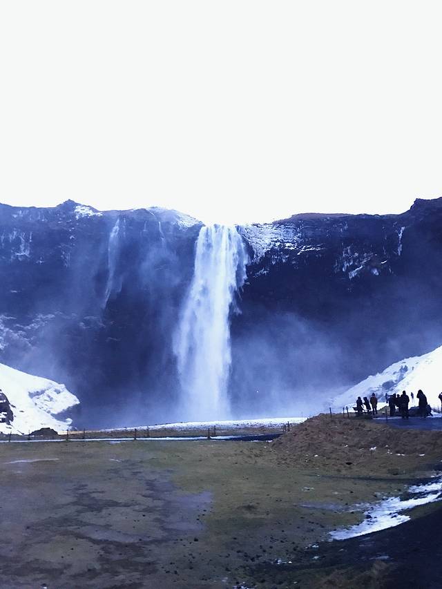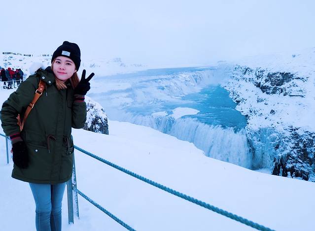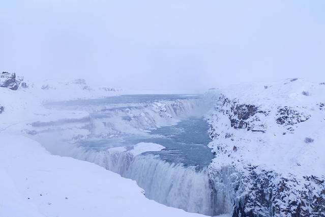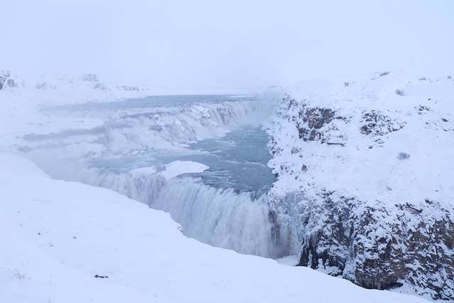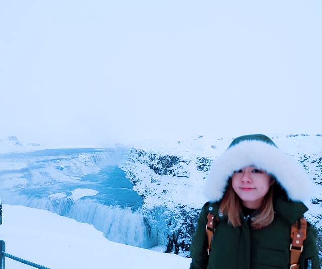 这个瀑布在夏天太阳照射下会有彩虹和亮晶晶的颜色,所以才叫黄金瀑布。由于前两天下大雪,又是另外一番景象了。