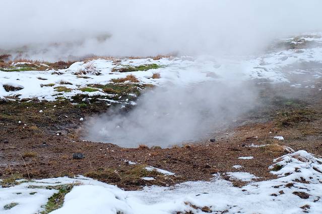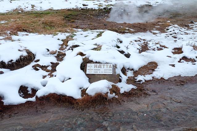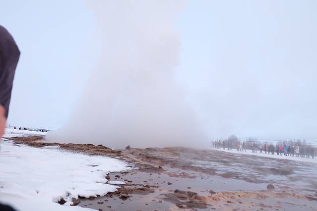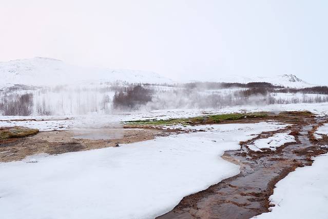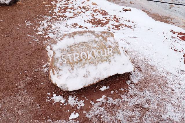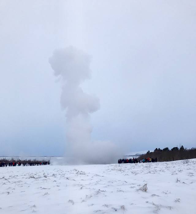 到间歇泉的时候天已经亮了,雪也变小了。一下车就闻到浓浓的臭鸡蛋味儿,听说每8-10分钟就会喷一次。我们打算赶紧看一下就去吃东西,没想到还录到了视频!!!确实是挺震撼的,不过每一喷臭鸡蛋味儿就更浓了。