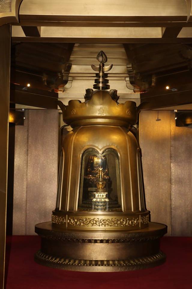 华严宝塔是继应县木塔之后全国第二大纯木榫卯结构的方形木塔,通高43米,上景金盘,下承莲池,塔下有约500平方米的千佛地宫,采用100吨纯铜打造而成,内供佛祖舍利及千尊佛像,金碧辉煌。是全国唯一铜质塔式地宫。