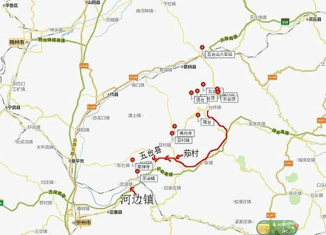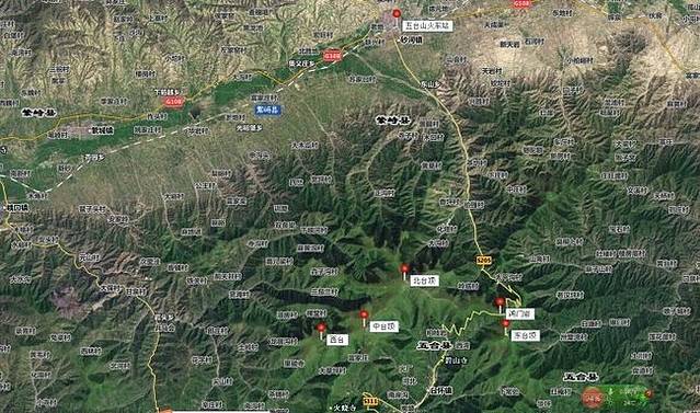 看上面地图,介绍如下:五台山风景区位于五台县台怀镇,镇子四周被东、南、西、北、中台五座山峰包绕,终年雨雪不断,春秋已是零度以下的严寒,五月九月都会飘雪;而鸿门岩在台怀镇北部,是进入五台山风景区的北大门,位于五台山的东台和北台之间;五台山火车站位于繁峙县砂河镇,鸿门岩就在砂河镇和台怀镇之间;而五台县,在五台山风景区西南,五台县汽车站在县城,而五台山汽车站则在台怀镇,只有山路,没有直通的高速。