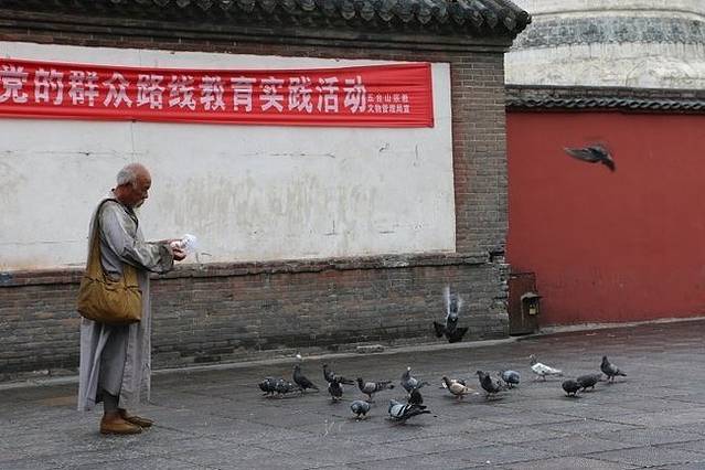 一个老居士在喂鸽子,背后的条幅很是抢镜。话说佛家净土,也难免俗,有点哭笑不得。。。