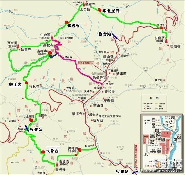 后者主要为佛教徒采用,为顺时针闭合路线。总长度大约100公里。从台怀镇开始→佛母洞→南台→气象站→南山门→金阁寺→狮子窝→吉祥寺→西台→中台→澡浴池寺→北台→鸿门岩→东台→鸿门岩→台怀镇