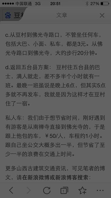 集福寺到菩萨顶是没有景区环保车的,只能打那种揽活的私家车,我从集福寺上到菩萨顶的车费是十五元。师傅姓曲,问他包车到佛光寺和南禅寺多少钱时,答曰400元。短暂的交往中感觉人还不错,就是车费要的有点离谱。
