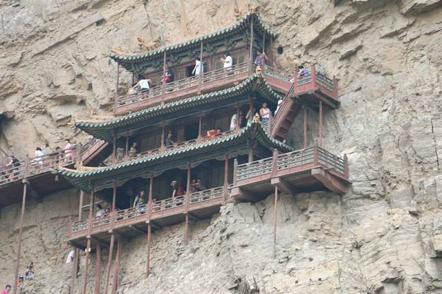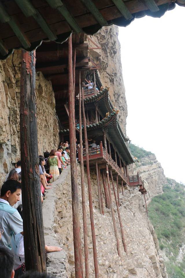 这悬空寺也是建于北魏,那么,就是说也一千五百年了。风雨、兵灾、地震、岁月都能这么岌岌可危的屹立这么多年,着实人间奇迹。比那比萨斜塔早七八百年呢!