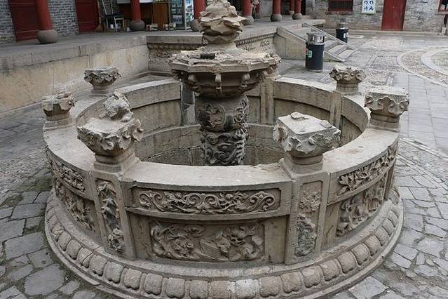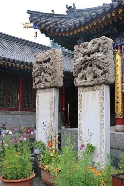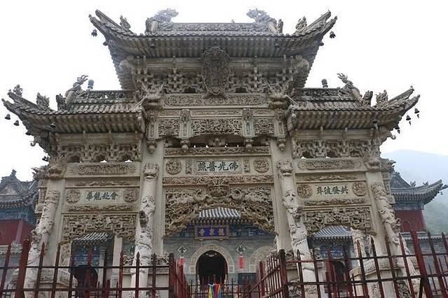 这段话摘自网络:“登上台阶,山门前就是一座三门四柱的石牌坊,牌坊全部用汉白玉镂空雕造而成,上面雕满了飞龙、宝境、玉壶等图案,玲珑剔透,工艺之精令人叹为观止。这座牌坊前后整整花了10年时间,是近代石雕艺术中的珍品。牌坊下的台阶底部,有一座细磨青砖照壁,照壁正中嵌的汉白玉石雕,可看成一幅五台山主要寺庙示意图,构思巧妙,刻工精细,堪称一绝。在中院的祖师殿前有一座墓塔,是为五台高僧普济所建,通体为汉白玉所筑,造型精美,亦为龙泉一绝。”