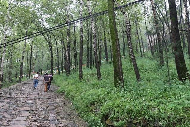 洒家若登这黛螺顶,自然不会乘此索道。登黛螺顶的山路有两条,一条沿北端的山脊而上,一条沿南端的山脊而上,两条山路从山脚下分开,到山顶寺前交汇,如括弧形。北端的山路略缓而斜,南端的山路基本是直上直下。决定回去吃了早餐再说,若有时间就登;若无时间,下次来大朝台的时候再登它一样。