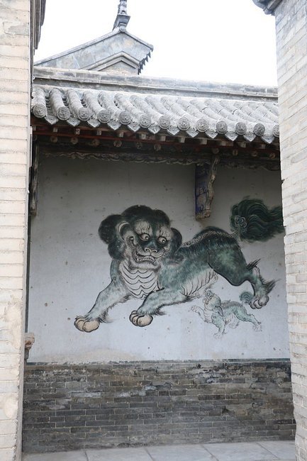 出门前,看到寺前有一堵高大的影壁,影壁墙上嵌的圆形石雕,正中一幅为“福寿三星共照”。雕工精细。据说也是五台山寺庙影壁中的精品之一。
