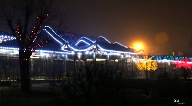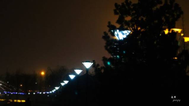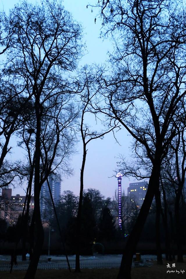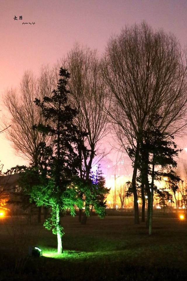 这天晚上,迎泽公园。建筑、树木、灯火、夜色使得拍出的照片很有意境。