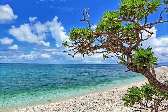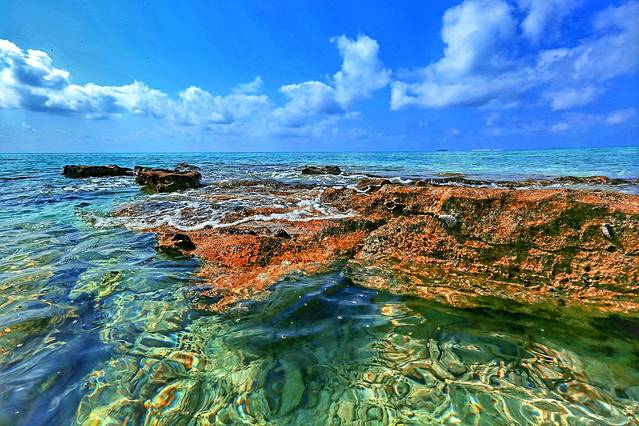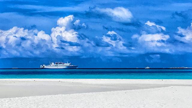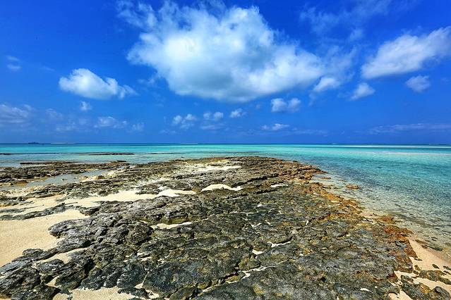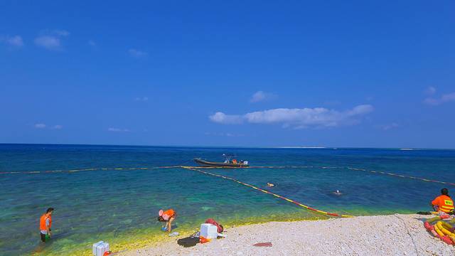 看日出的时候其实就离岛很近了,第一站是全富岛,从地图上看全富岛蛮大的,实际上只有很小一块露在海面,余下的都都是暗礁,所以邮轮会停在离岛不远的地方,然后坐接驳船上岸。到达全富岛附近的时候,海水一下子变得清浅起来,跟之前浓墨一样的深蓝形成鲜明对比,画风一下子就变成阳光海岛了。