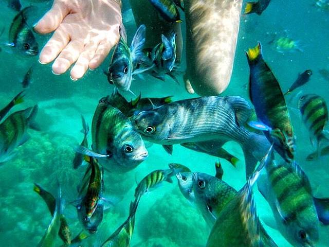 岛上的渔民都很淳朴,捕到的鱼除了运回陆地和留下自己吃的之外,还会存下一缸,用来招待每周到达岛上的游客。小螺100元一筐,鱼虾50到300元不等,即使这样依然可以跟他们讲讲价,花50块钱就能买到两个小砗磲或大螺。