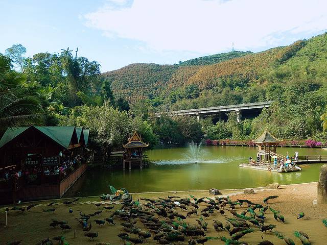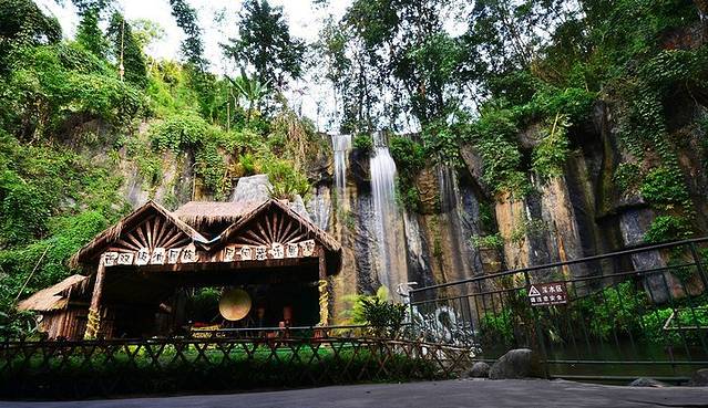 西双版纳原始森林公园内有北回归线以南保存最完好的热带沟谷雨林,还有孔雀繁殖基地、猴子驯养基地、大型民族风情演艺场、九龙飞瀑、曼双龙白塔、民族风味烧烤场等50多个景点。独特的热带沟谷雨林横亘整个园区,美丽的莱阳河宛如一条金腰带,流淌在绿色的丛林之中,沿途可尽赏板根、绞杀、老茎生花、古藤等奇异景观,还能观赏到数百只孔雀放飞的壮观场面。除了自然景观,爱伲山寨的民俗风情和节庆活动也会让人流连忘返。