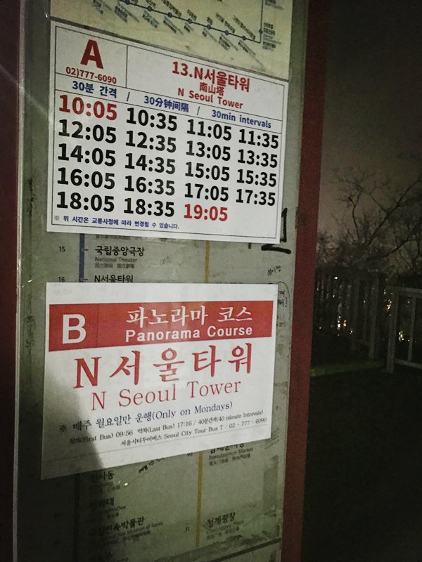 去首尔塔有公交车,路牌如下,其他的大家可自行百度哟~~关于门票,不登顶,free哒
