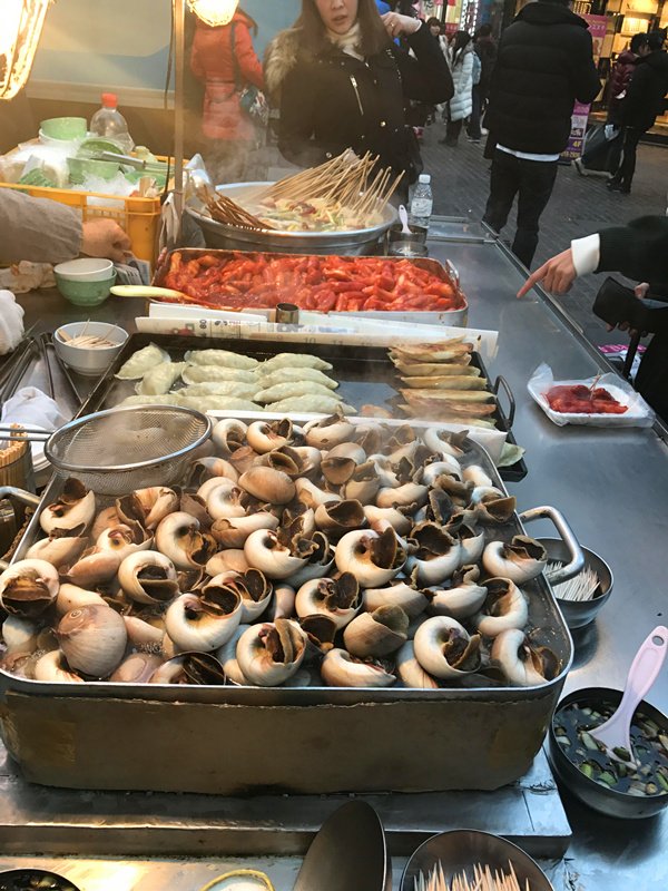 韩国吃的东西其实没有国内那么丰富,上图就包含了四种常见路边小吃。螺,一份1万韩币,尝尝就好,特别喜欢的可以多次。尤其推荐最里面的那个叫做鱼糕的东西,可以免费喝汤,可以蘸酱紫,实在好吃!!