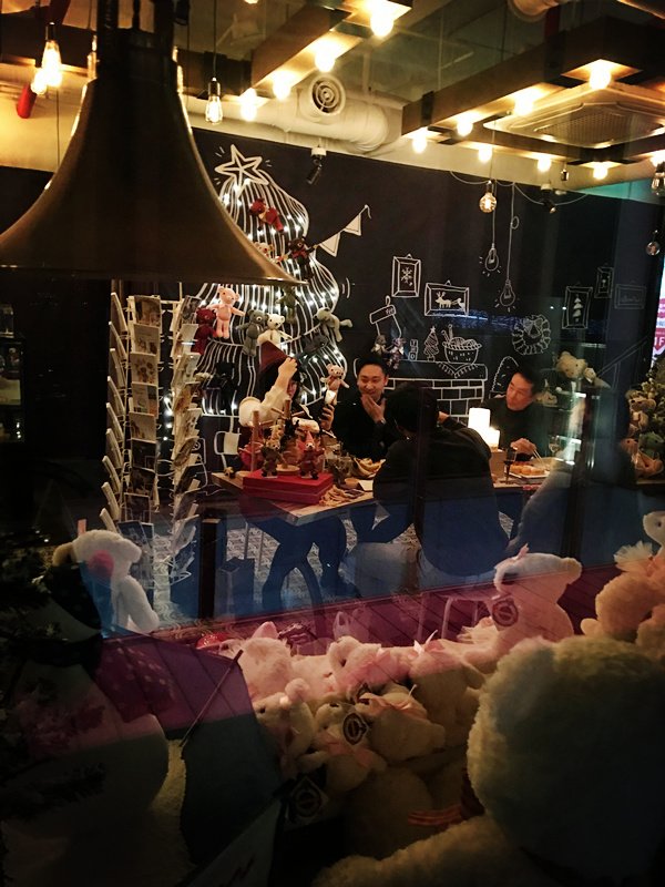 隔着玻璃,什么声音都听不到的情况下,我们竟然和在里面吃饭的人Body language了好久。。