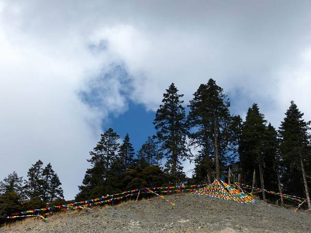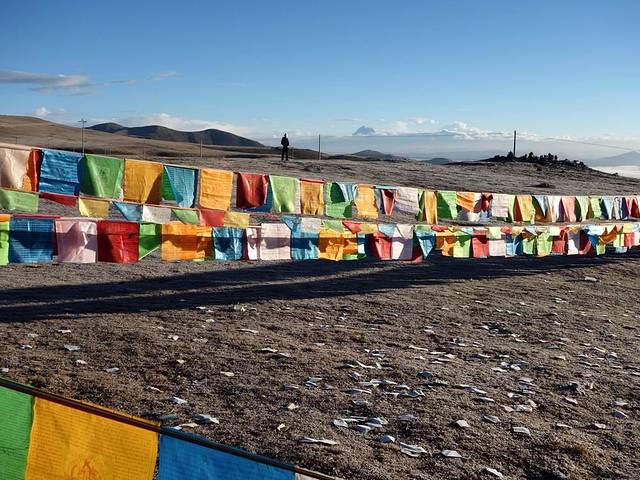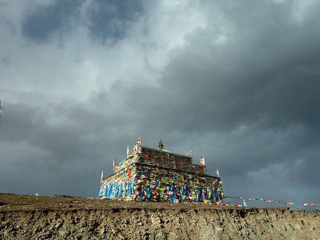 折多山垭口虽然被称作关,但附近却没有太多建筑,这是石碑后上方有一座挂满经幡的白塔。