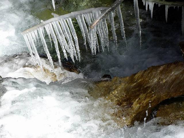 这里的海拔4000米左右,太阳还在山尖,早晨的气温很低,穿着冲锋衣依然感觉寒冷刺骨,戴着手套的双手知觉麻木。图为贡嘎河上凝结的冰溜。
