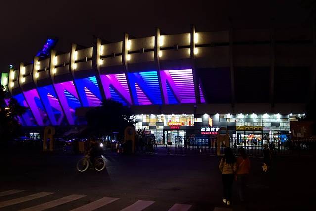 10月28日早06:30,我们在成都体育中心东门统一集合。发车时,53个座已经坐的满满的,连第一排副司机旁边都坐上了人,估计第一天出发时,我们这个团的人数是51人。但第一天到新都桥(海拔3300米左右),就有4个人因为高原反应睡不着觉,第二天便脱团了。以后每天都有人离开(其中离开亚丁,有11人从稻城机场乘飞机回成都),最后一天回成都时,只有30多人了。这是头一天晚上我踩点时,拍摄的成都体育中心东门外景。