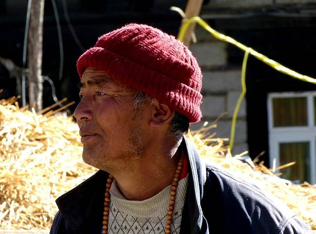 村子位于山间台地上,峡谷中出现这样的台地让人有种恍若隔世的感觉。四周是起伏着的苍凉群山,在蓝色天空映衬下,山峦的轮廓青黑晶亮。山谷的尽头,巍峨的仙乃日雪峰毫无保留地沐浴在阳光之下,简练而险峻,像寥寥几笔勾勒出的简笔画。然而山峰的高度、宽度和质感却幽暗险峻,雄伟而安详,绝非笔墨所能形容。照片摄于亚丁村。