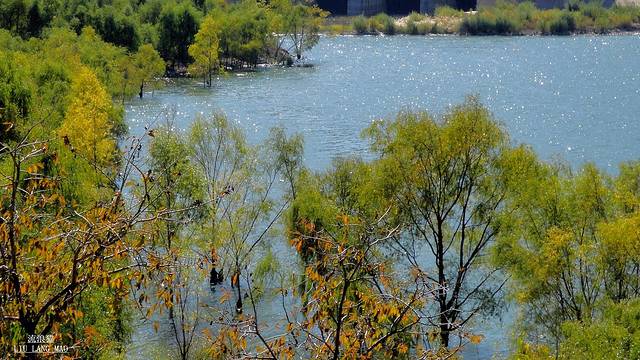 水库大坝,今年水位高,下面的柳树都淹没了。