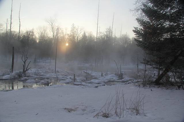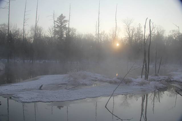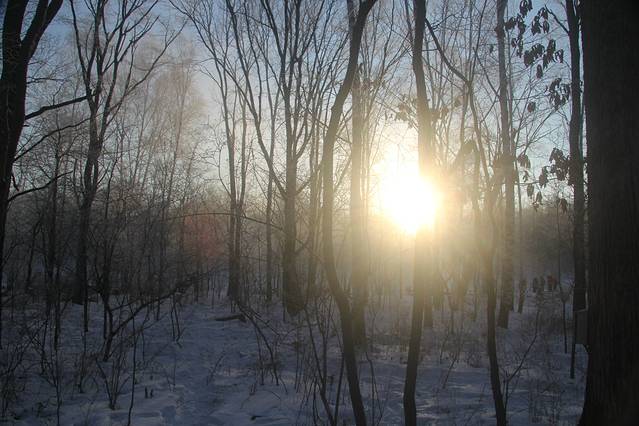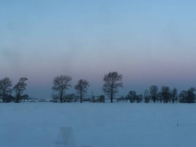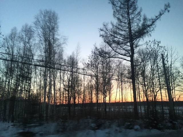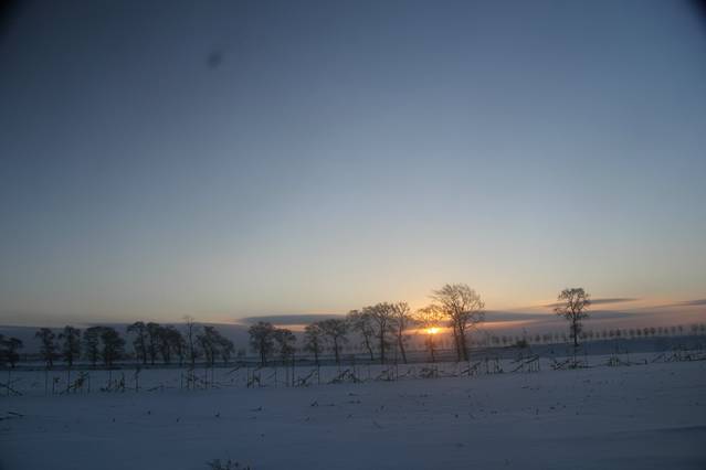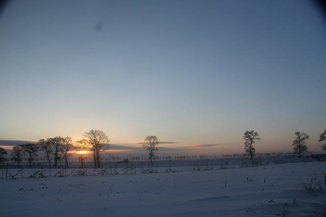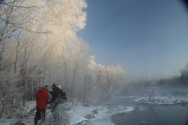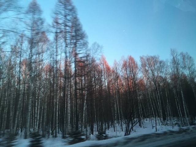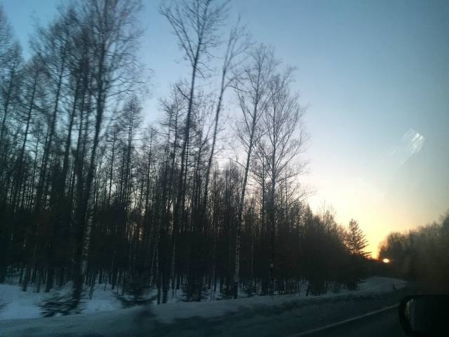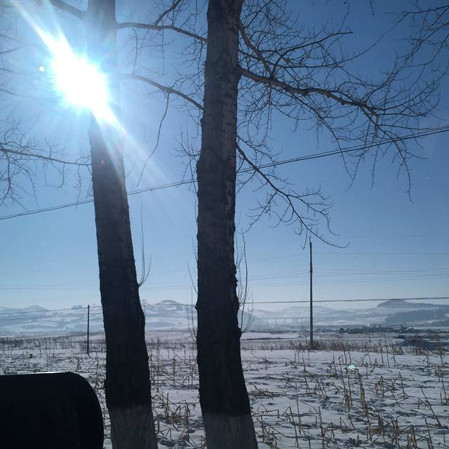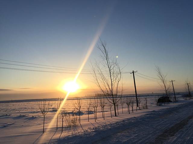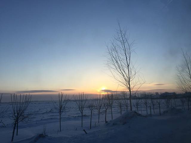 早上5:50出发去雾凇岛,车程约40分钟,但是因为前一天下了大雪,车开不快,所以开了1个小时这样才到达。雾凇的形成需要雾和低温。前一天下大雪,第二天温度又不够低,所以就抱着碰碰运气的心态,果然还是没碰上,但是看到了很美的雪上日出。