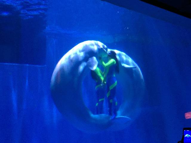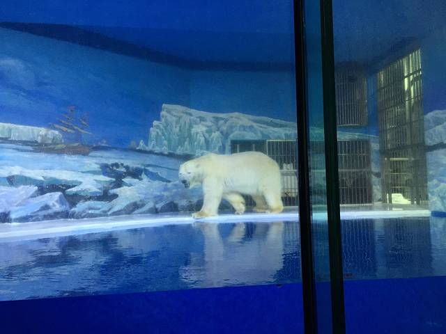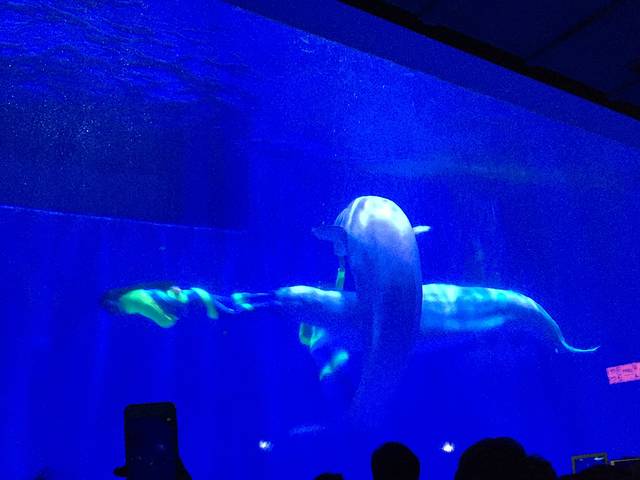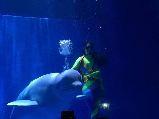 虽然哈尔滨极地馆有点小,但是里面的白鲸表演真的是震撼!白鲸好优雅、聪明、可爱!据说2条白鲸一起表演是全中国独有的,训练师花了4年时间才配合默契,水温是13摄氏度,水上是10摄氏度,所以每位训练师每天只能下水表演1次。