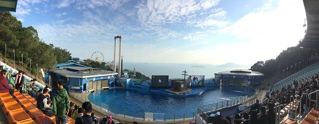 酒店对面的公交站坐几站就到了。抵达海洋公园立马坐缆车上山,风景优美,秀色可餐。恐高的我,也觉得非常棒,缆车超级稳。上面玩好了,嫌累的话可以坐那个火车下山,也不需要排队。五点看海事和海豚表演,开场竟然还有人求婚,哈哈,撒狗粮。