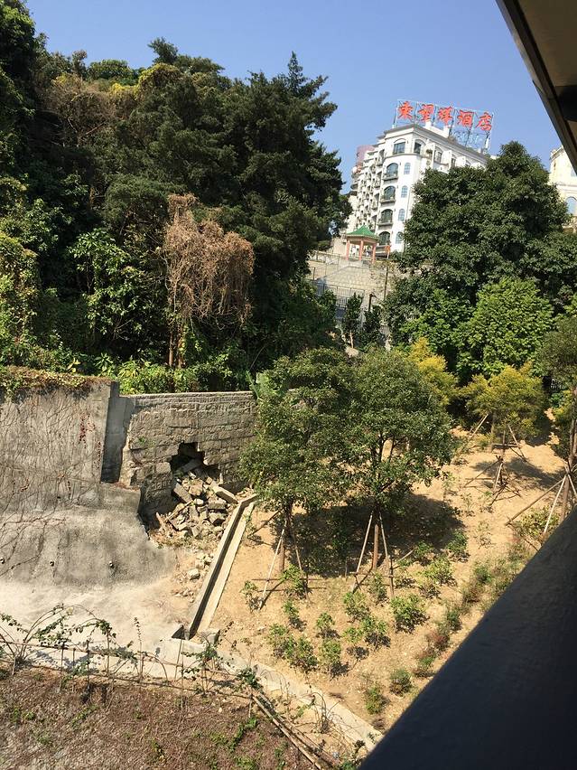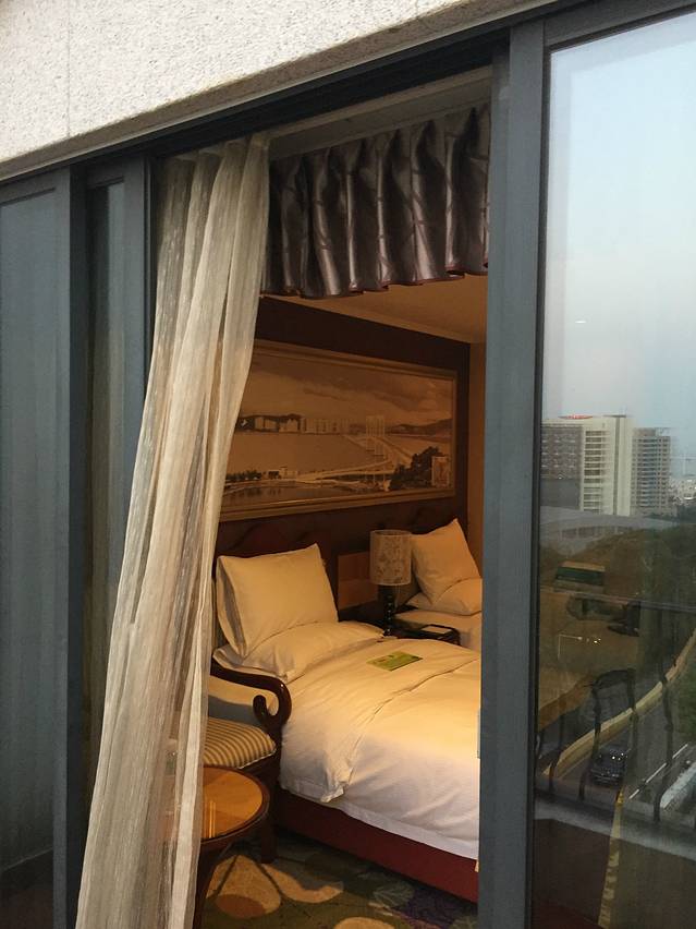 酒店阳台。对面是松山炮台和灯塔,美丽。盘山公路。远远的可以看到,那个是海吗?