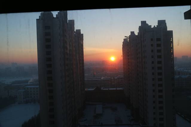 站在海拉尔春天假日酒店的窗前看日出