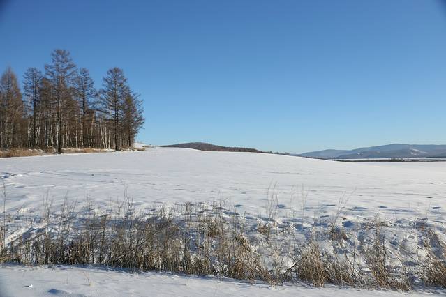 踏着白雪,我们深一脚浅一脚地登上草原最高点看莫日格勒河。