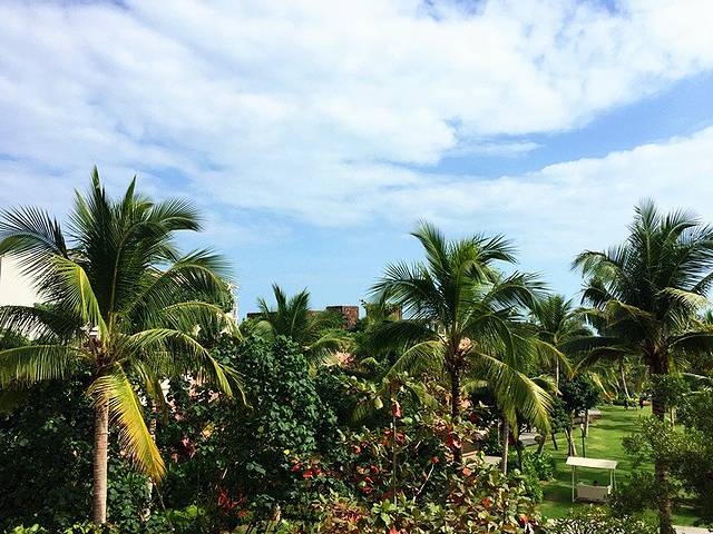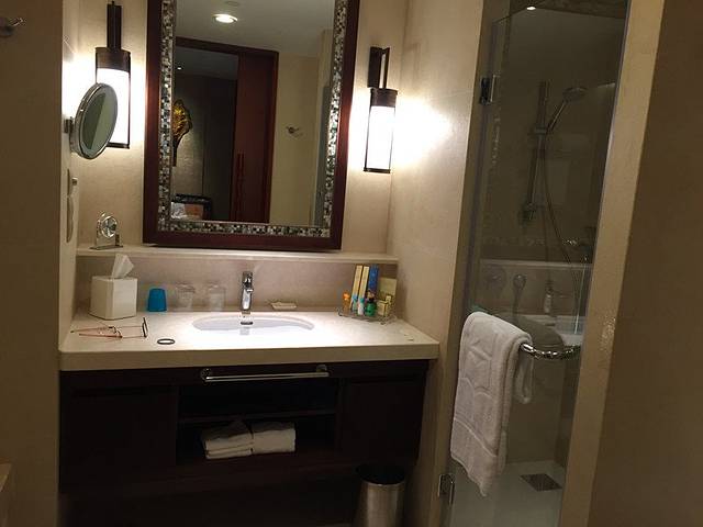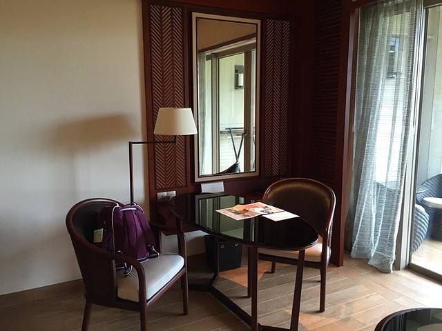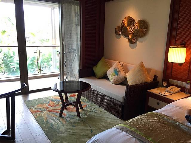 从机场驾车走高速到海棠湾大概一个小时的时间,路上车不多,很畅通。海南的高速都是免费的,但油费很贵,而且海棠湾加油站十分稀少,我们是找到附近的小镇加了满满的油,吃了午饭,才去酒店办理入住。香格里拉酒店很好找,因为那一带都是各大五星酒店,顺着找就行了,何况还有gps。酒店的规矩都是下午两点办理入住,我们一点半到达,先办理入住手续,但工作人员告诉我由于团队活动,房间暂时还没有让我稍等一下。房费我是之前就付好了的,又刷了6000的预授权。酒店工作人员服务很好,都面带微笑的帮助我们。酒店大堂很敞亮,虽然不大,但很通透,对面的海风一吹简直棒呆。没有房间也罢,就先在酒店大堂吹吹海风,沙发上休息一下也很惬意。