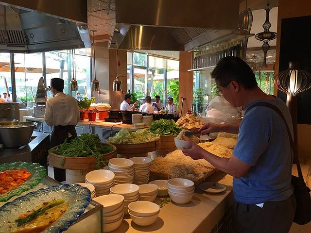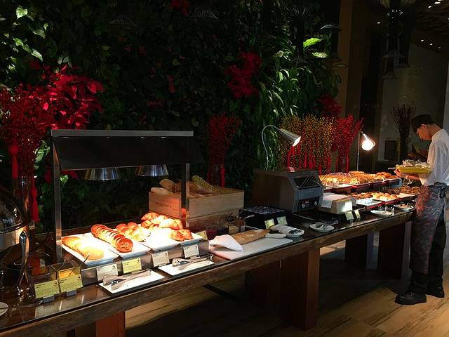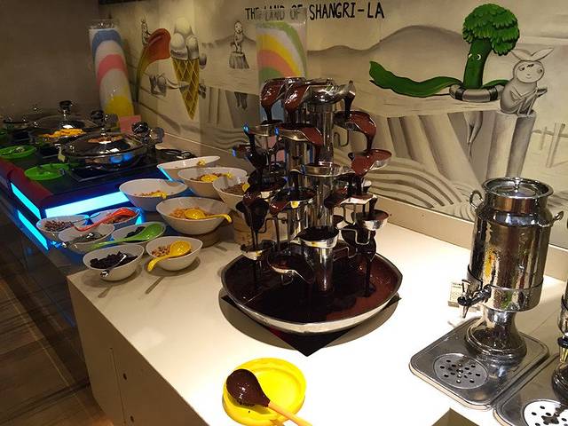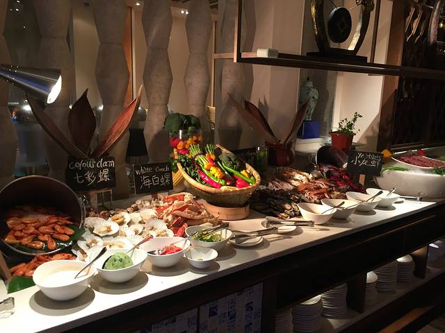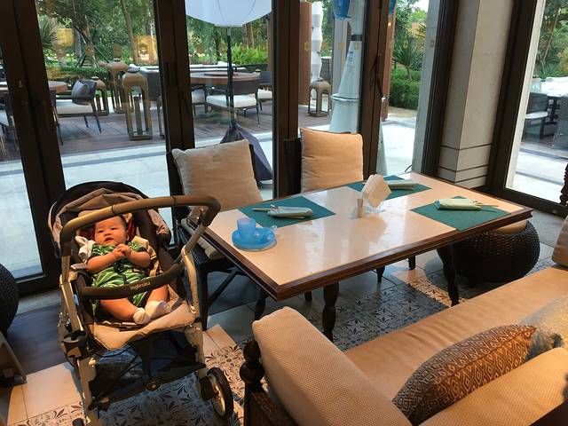 由于晚上要吃大餐,我们决定中午简单垫垫,省出肚子来。在酒店休息完,大概下午5:30了,我们来到香格里拉的熹餐厅,开始海鲜烧烤自助大餐。(上图)总的来说:海鲜很多,肉质新鲜,烧烤实在一般,甜品和饮品很赞,同样也有儿童区。要想吃回票价,就捡着螃蟹,大龙虾和三文鱼吃就行…胖能比较惨,不能吃光盯着我们吃,馋到不行,快结束的时候,睡着了……我们推着胖能回房间休息了。