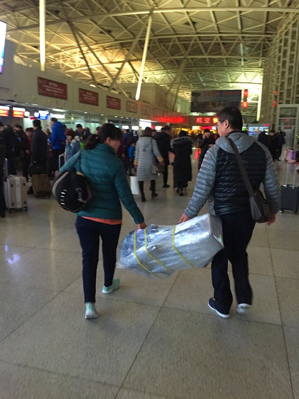 1.5日早上7:15的灰机,因为济南大雾霾,前几天的航班都延误或者取消了,我们非常担心5号早上的飞机也不能准点。谁知道,竟然准时。我们5:00出发,能能也很给力的4:30就醒了。顺利的到机场,顺利的check in,顺利的托运,顺利的过安检。给大家看一下被捆成棍棍的婴儿车!