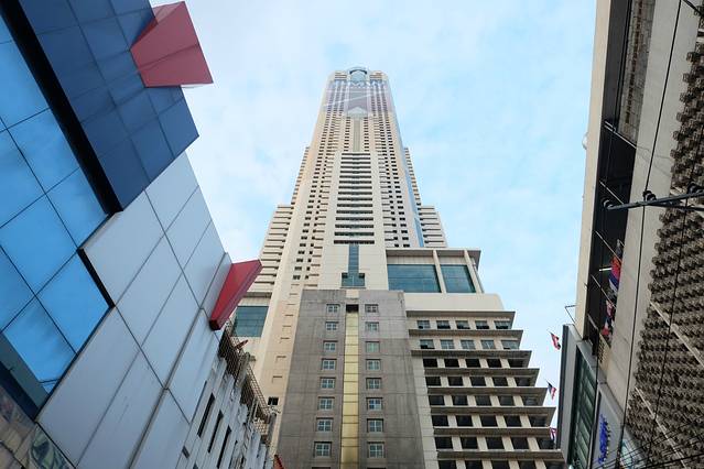 彩虹云霄酒店。74楼是中式自助餐;76楼是曼谷自助餐;82楼西式自助餐。当然楼层越高,自助消费越高。作者是76楼的,每人990泰铢。